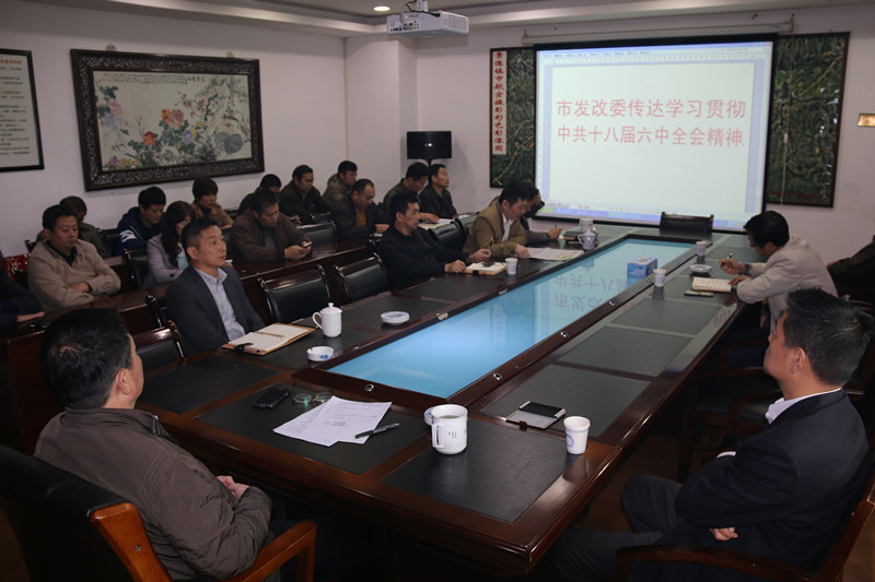 11月1日下午,市发改委在委会议室召开了科级以上干部会议,传达学习党的十八届六中全会精神,研究贯彻落实意见。大会由委党组书记、主任闫浩同志主持,委党组成员、机关党委书记任赣鹏宣读党的十八届六中全会精神报告,闫浩解读了十八届六中全会公报十二个关键词和报告中对党员干部提出的十五条要求,最后结合全会精神对我委当前工作进行了布置:1.全面落实今年各项指标目标任务;2.认真谋划好2017年重大项目,同时加大推进2016年重大项目;3.争取中央资金和项目及政策;4.落实重大任务和事项。